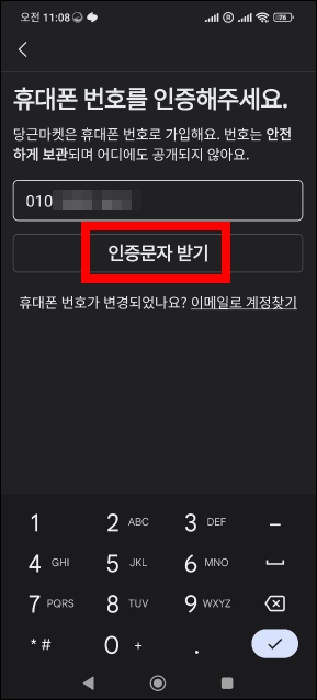 해당 휴대폰에서 인증문자를 받으면, 따로 문자를 확인하고 입력하지 않아도, 바로 아래의 화면으로 자동으로 넘어 갑니다.