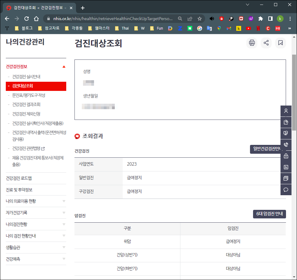 이제 아래와 같이 건강검진 대상자 조회가 완료 되었습니다. 개인적으로 해외에 오래 나와있는지라, 아래와 같이 급여정지 상태로 결과가 보여지네요.