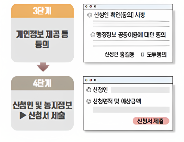 1단계. 간편 신청 대상자에게는 휴대폰으로 수신문자가 갑니다. 링크를 클릭하고 들어가야합니다. 2 단계. 링크로 들어간 사이트에서 성명, 주민번호, 휴대폰 번호와 같은 내용으로 개인 인증을 합니다. ![]() 3단계. 다음 화면으로 넘어가면 개인정보 제공에 동의를 해야합니다. 4단계. 마지막으로 신청인 및 농지정보를 확인하고 신청서를 제출하면 됩니다. ![]() |