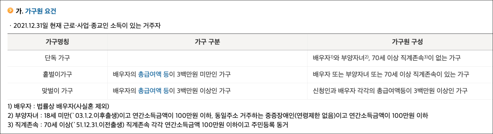 - 맞벌이 가구는 신청인, 배우자 각각의 총 급여액 등이 3백만 원 이상인 가구.